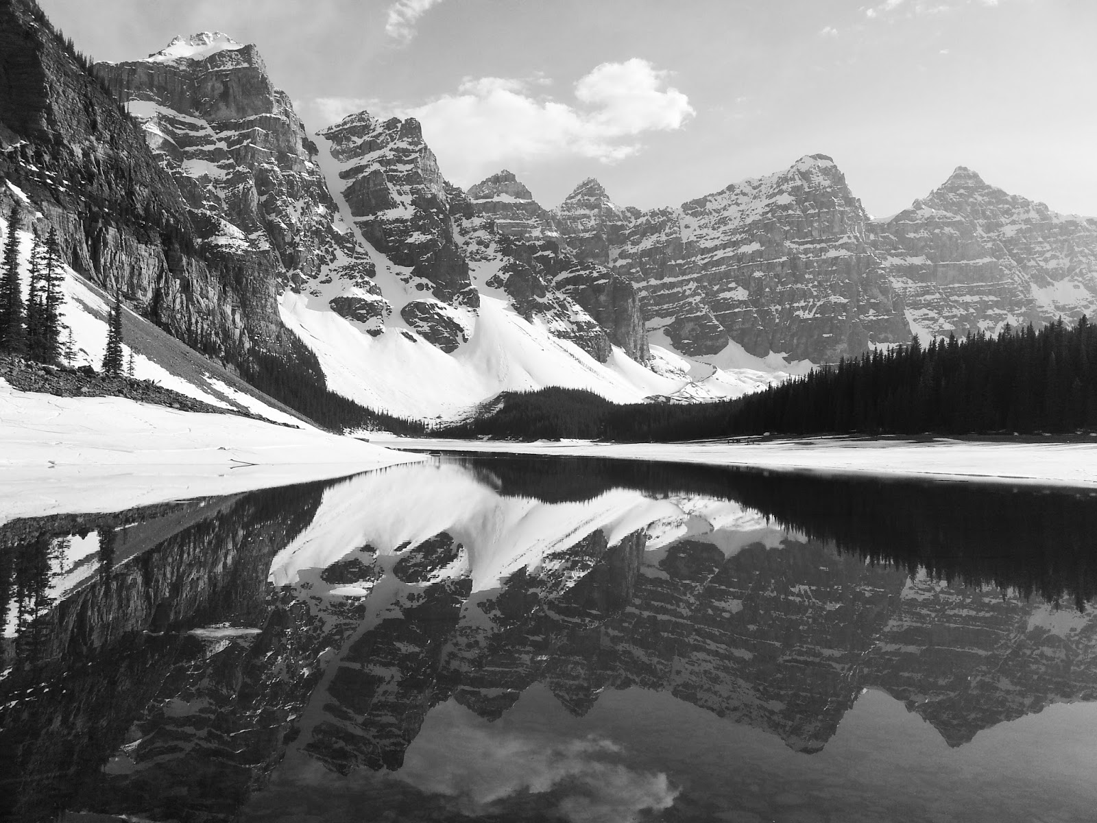 Then it was a 7 mile drive to Moraine Lake. The light was good here too although going fast. It was 5.30pm. Some noisy people were ahead but headed straight ahead south along the snowy lake shore. The lake was mostly frozen but I could see some clear water to the left so headed for that hoping for reflections.