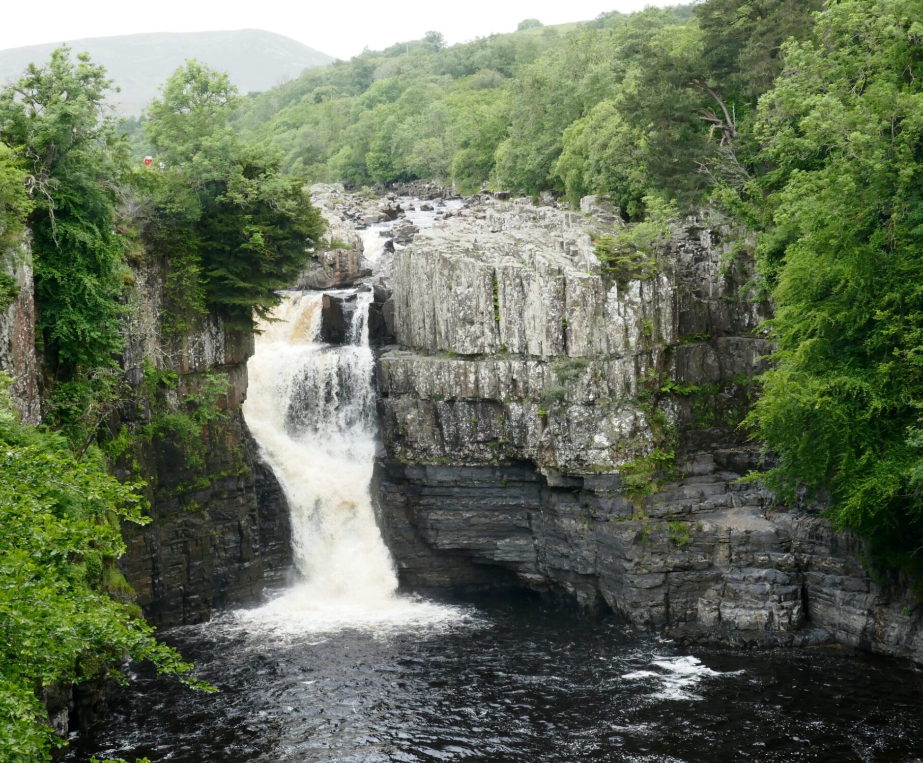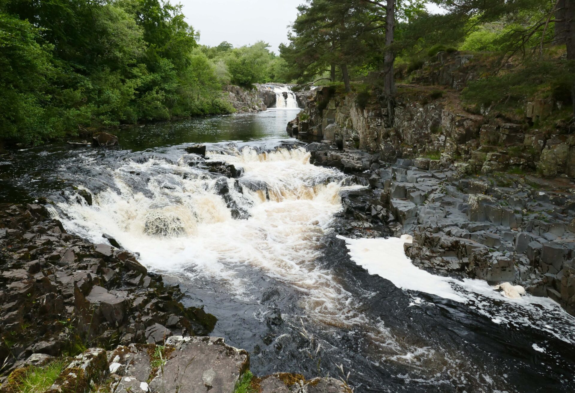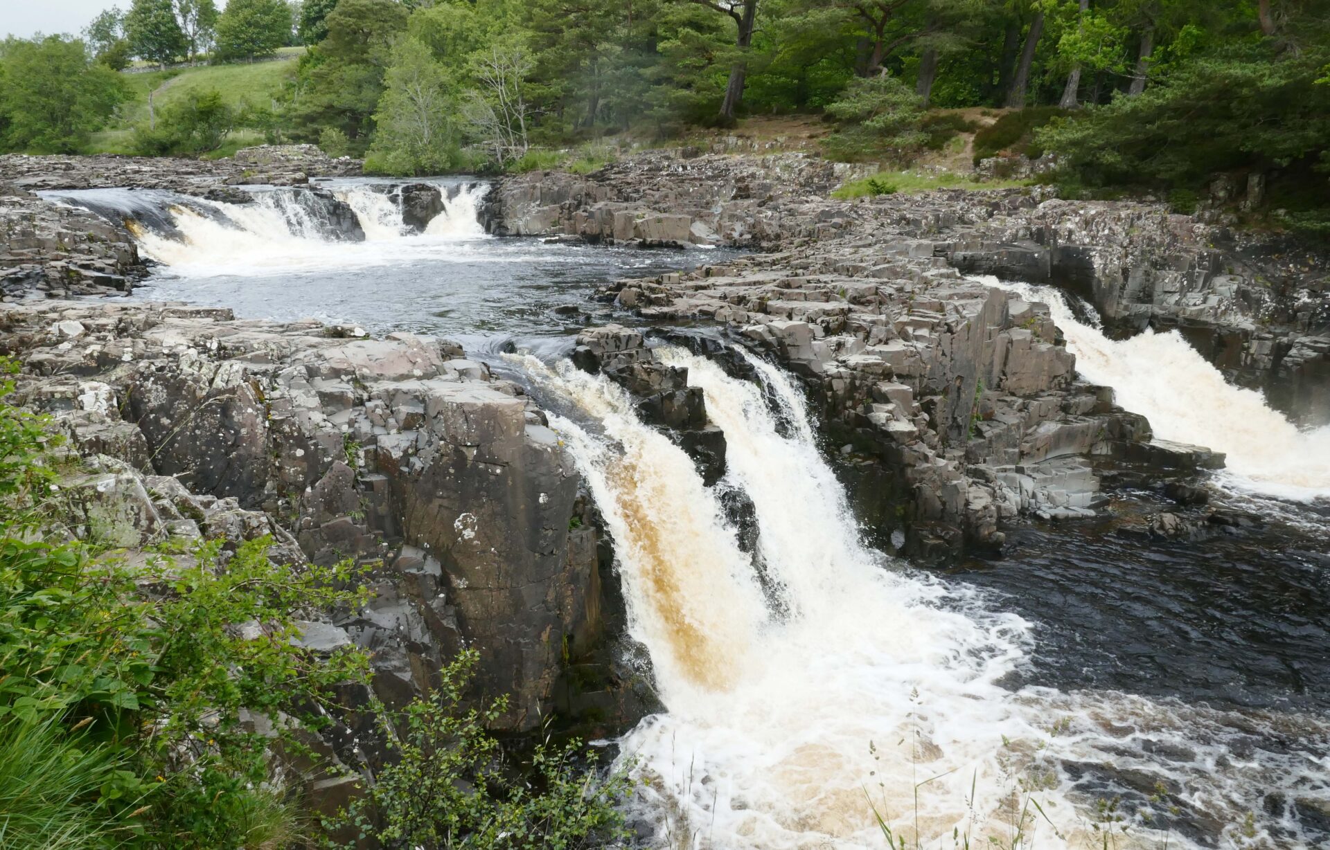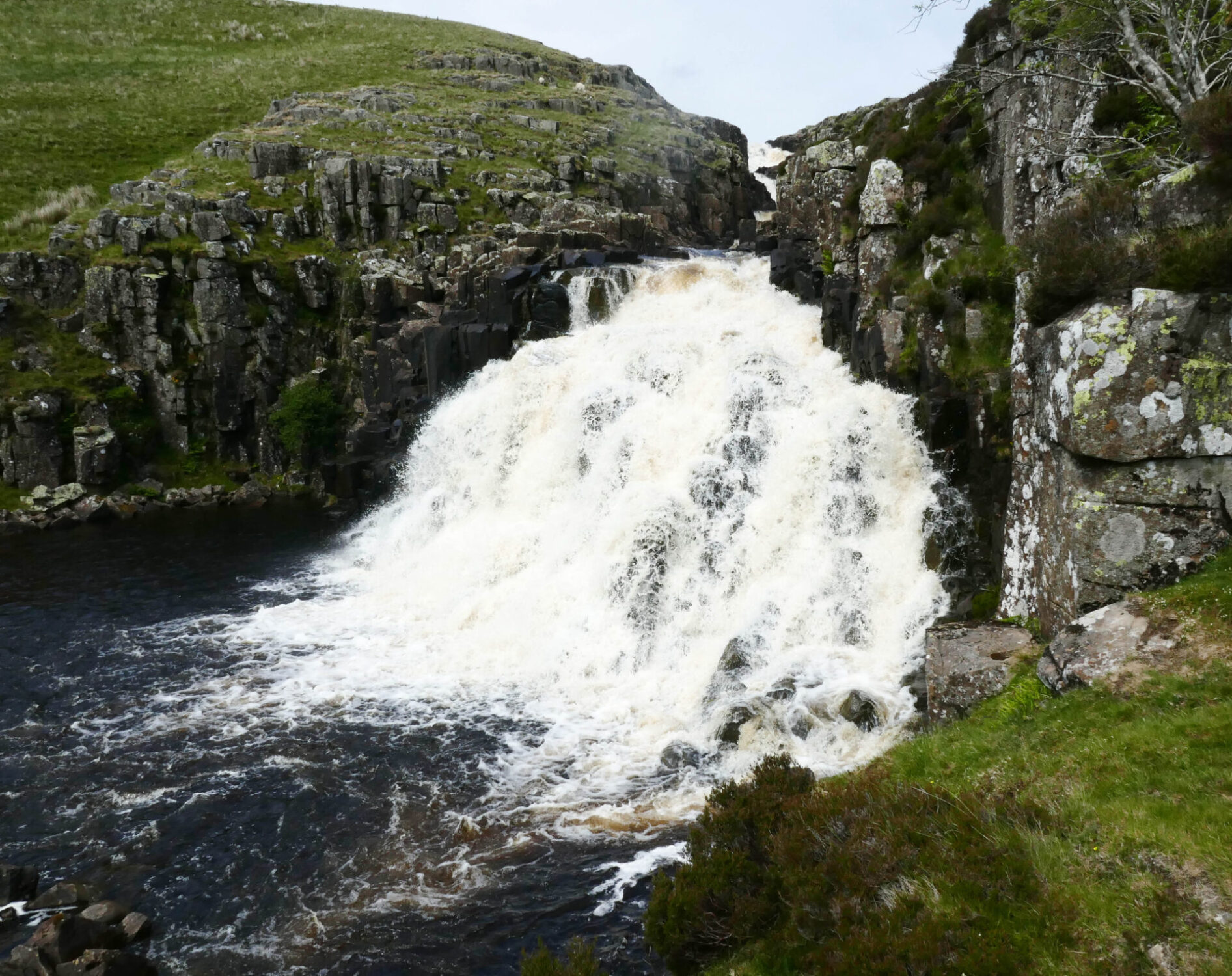 We reached the top of High Force at 11.20am, it was in full flow as you can see from the full frontal photo. I think it makes a better shot from this side of the river and it’s a free viewpoint whereas from the hotel side they charge a fee to see it.