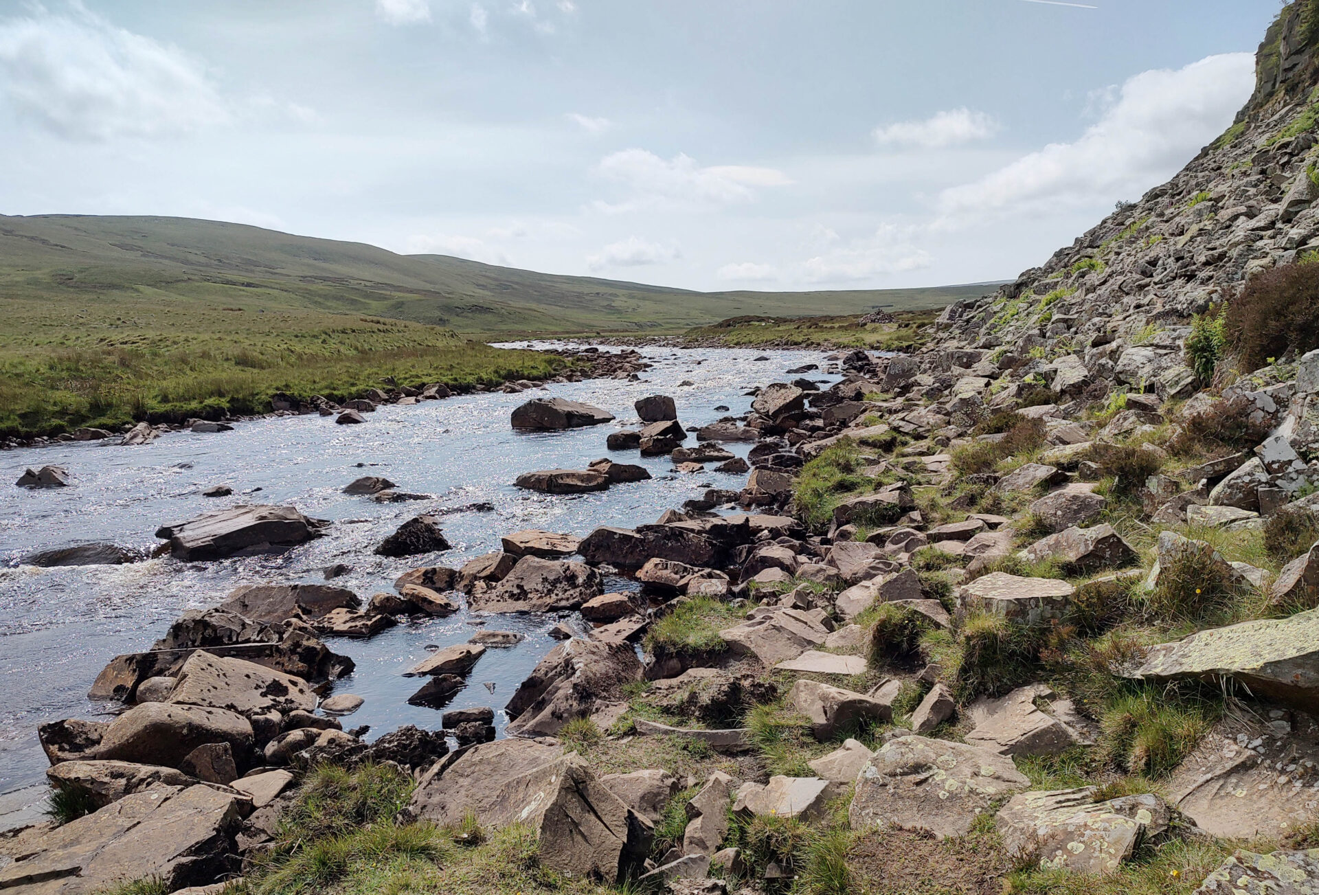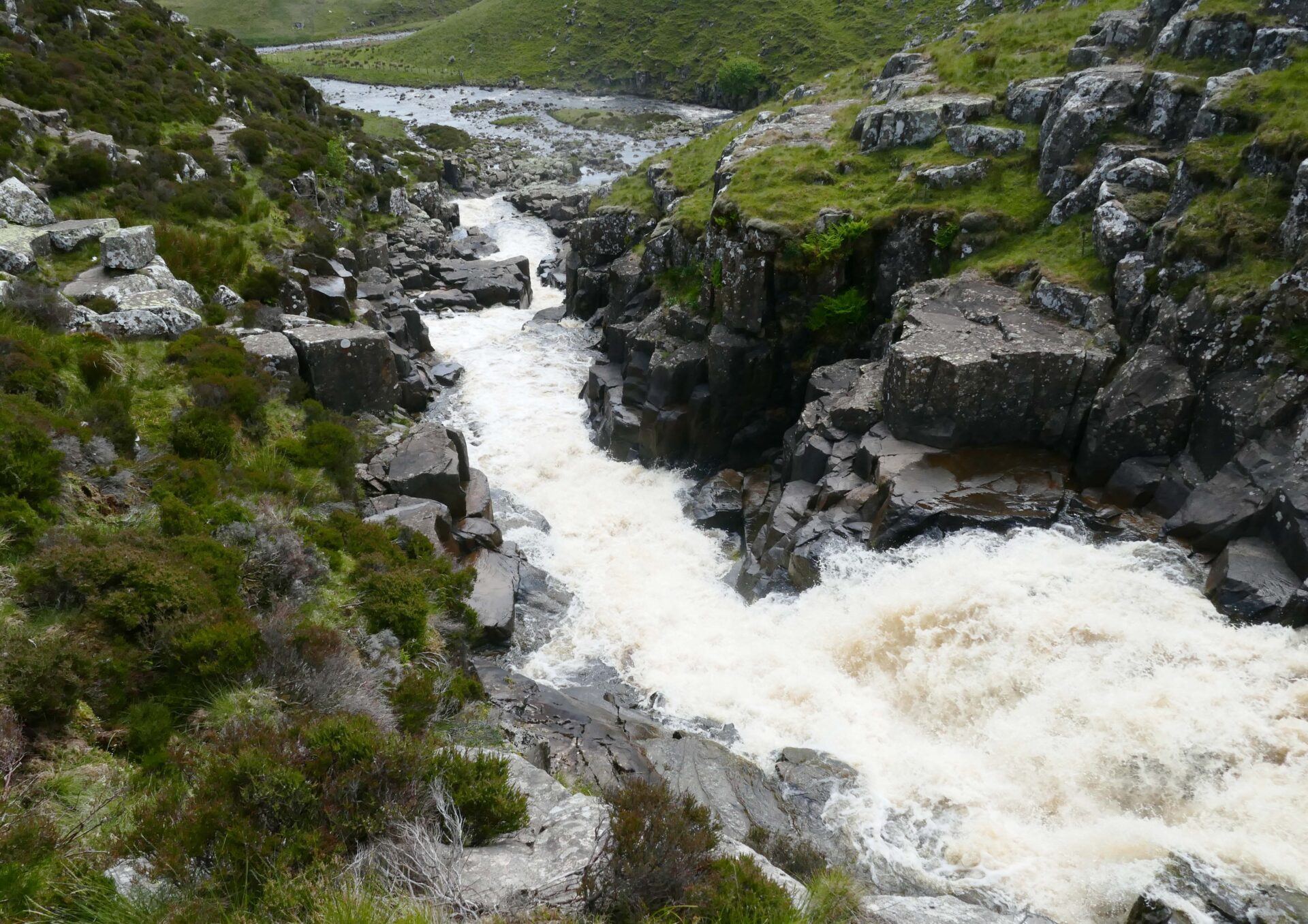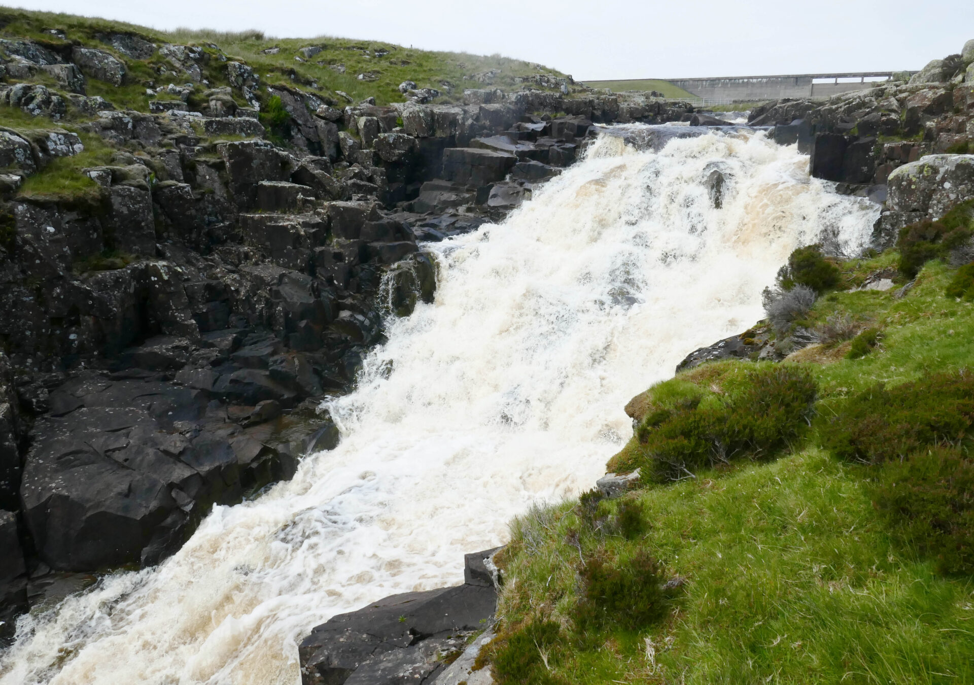 We were soon on the track to Blake Dale Farm, through the farmyard and out to the bridge below Cow Green Reservoir dam at 2.40pm. The next bit was dreadful, there was no path so we had to clamber down steep slopes covered in thick high heather and steep rocky sections. The thunderous water of Cauldron Snout was on our right the whole time, a very impressive sight, especially from the bottom.
