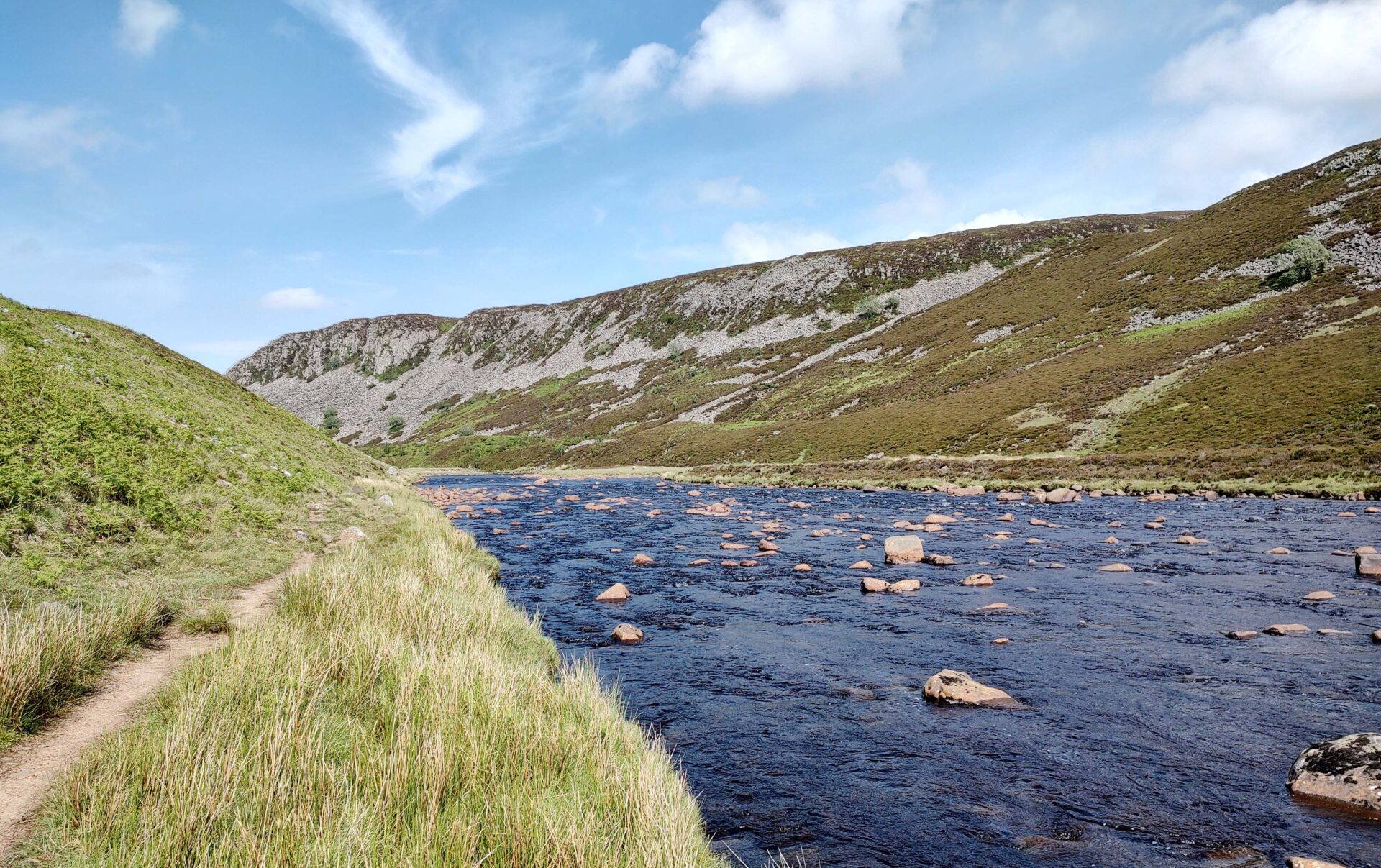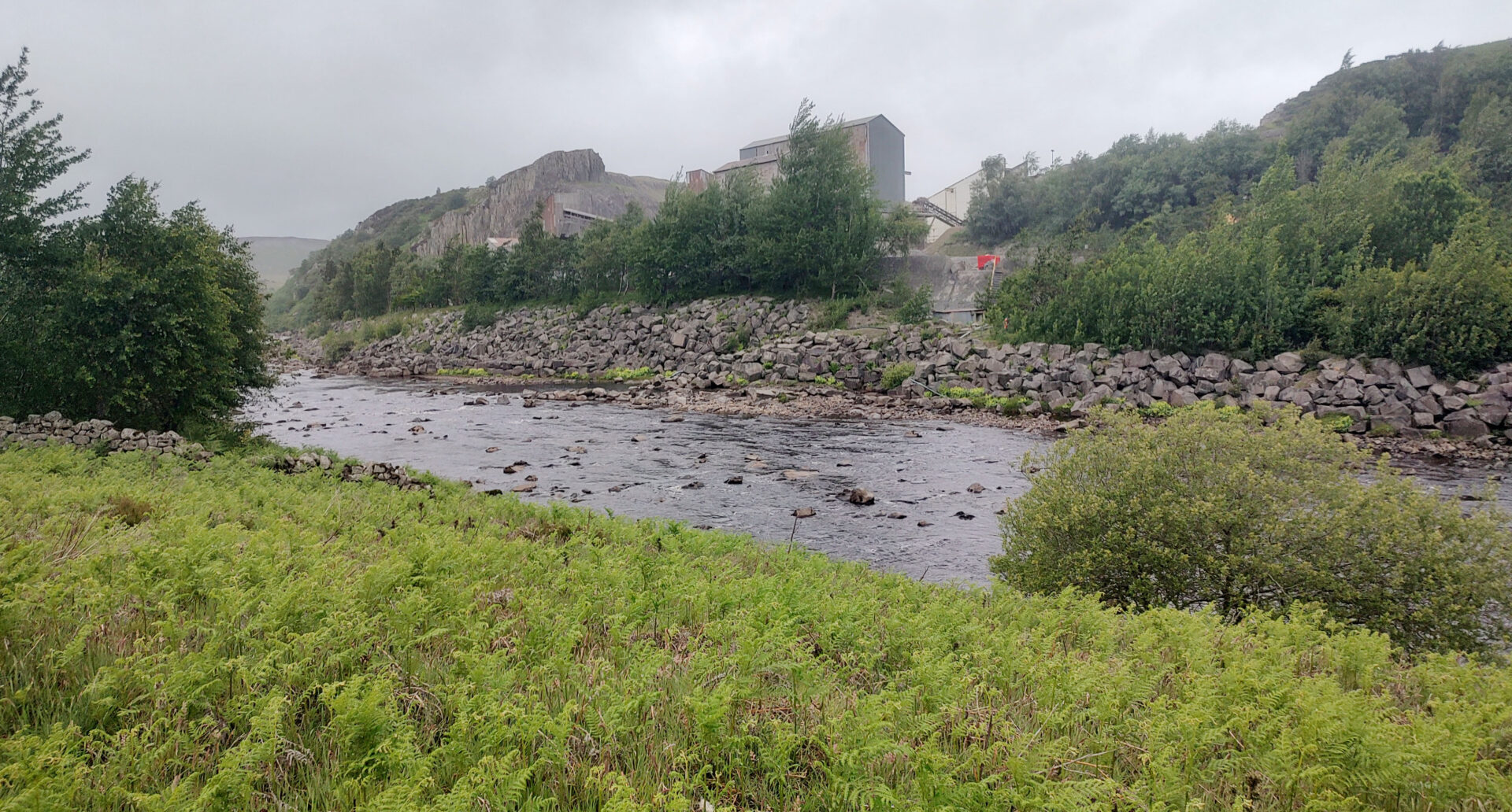 We crossed the river again by another bridge and followed the route up the hill behind Cronkley Farm and down Bracken Rigg to a riverside path. Soon after this was a large quarry on the opposite bank, a little incongruous in such beautiful surroundings.