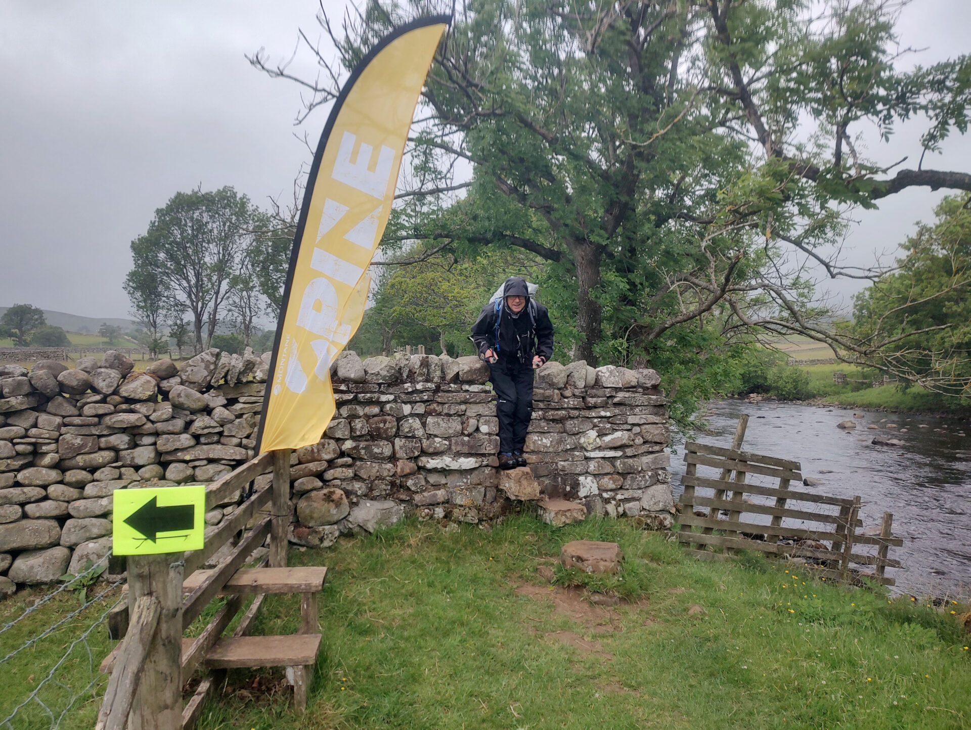 The path just follows the river, past some smaller falls called Low Force and the Wynch Bridge (a suspension foot bridge giving access from the Bowlees car park), all the way to Middleton-in-Teesdale. We had a short lunch break sitting on one of the stone stiles in the rain at 12.20pm, just after Wynch Bridge. We also chatted to one of the Spine Race marshalls for several minutes just on the edge of Middleton.