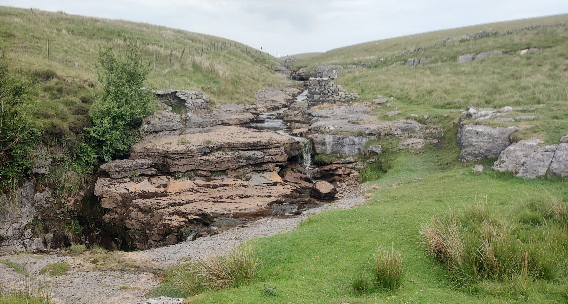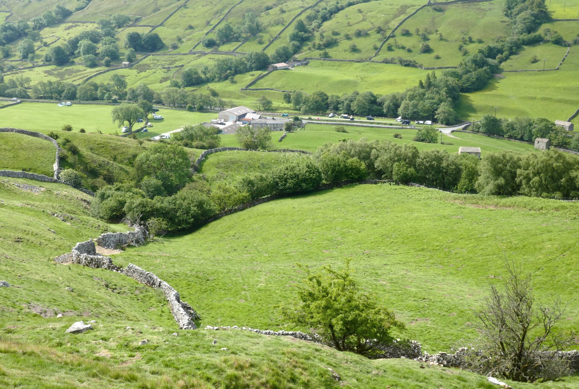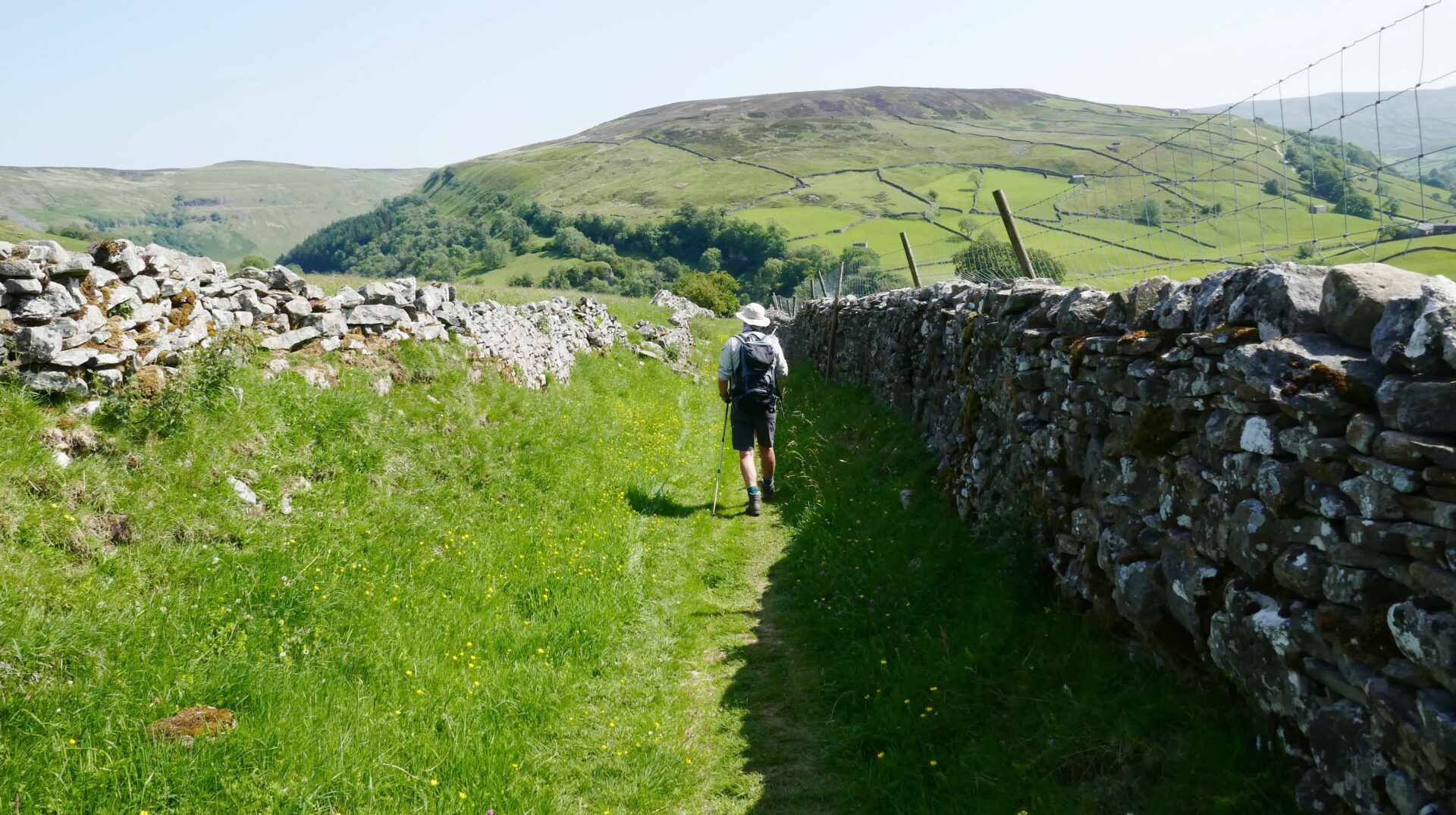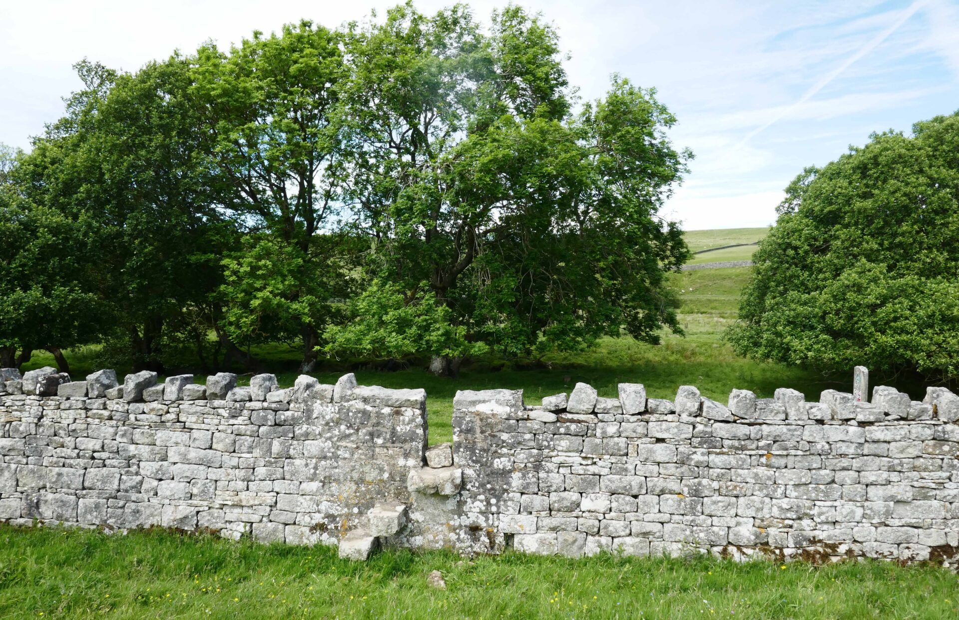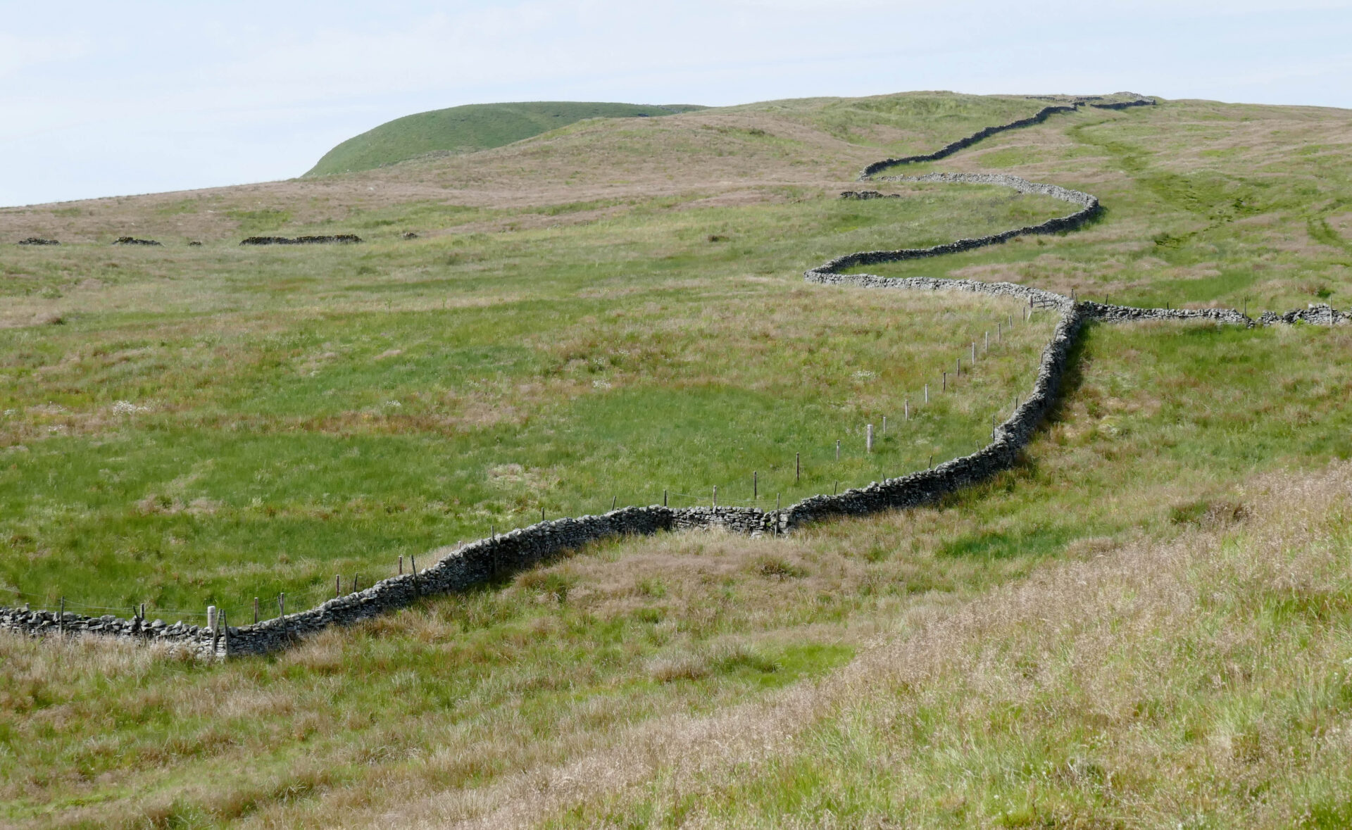 We left the hotel a bit after 9am and headed for the Pennine Way path beside the church. Unfortunately, it was closed so we went through the churchyard instead, which brought us onto the closed path just beyond the closure. From there a good footpath led us around the outskirts of Hawes and neighbouring Gayle to open country. Looking ahead to the dry stone walls it looked like they had been built by someone after a session in the pub! We’re used to seeing walls built in straight lines but these weaved left and right over the hillside ahead.