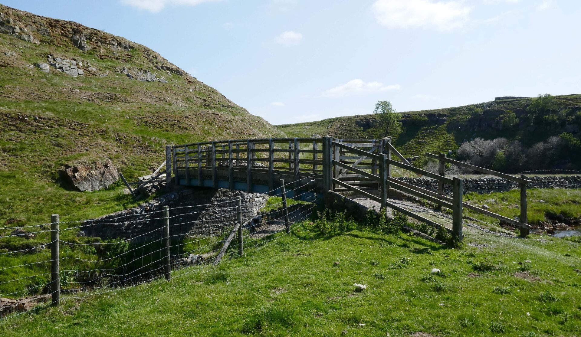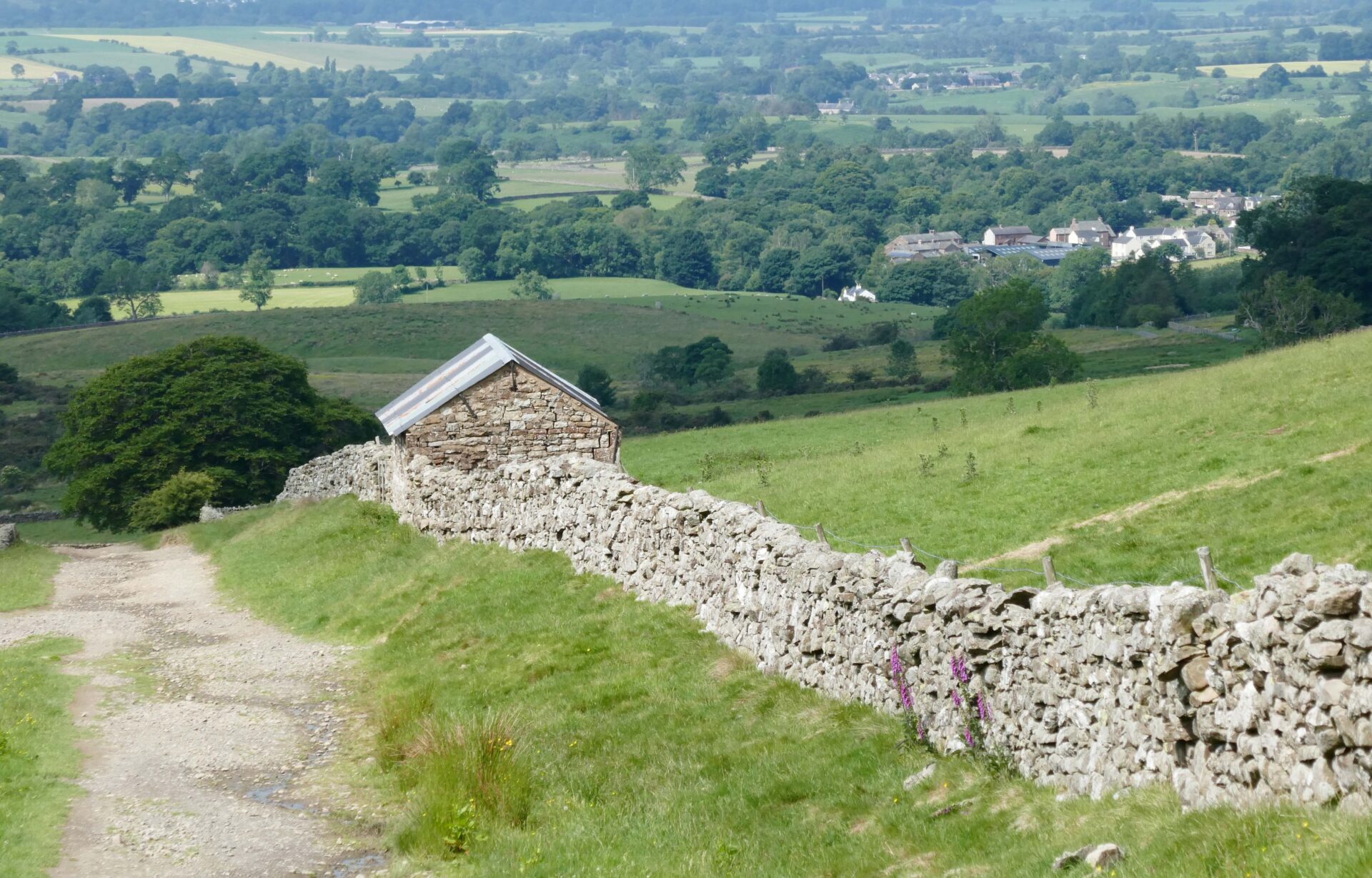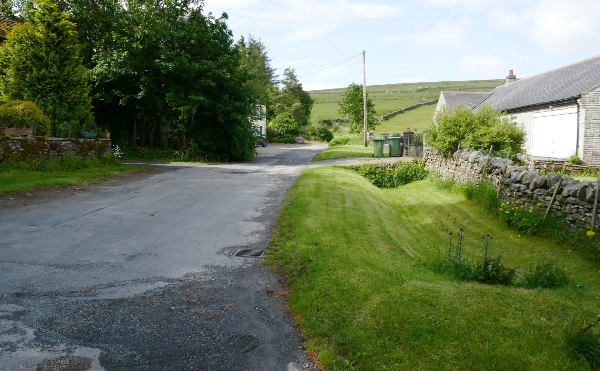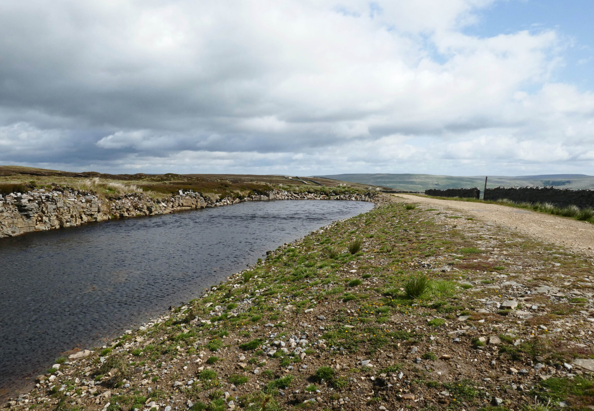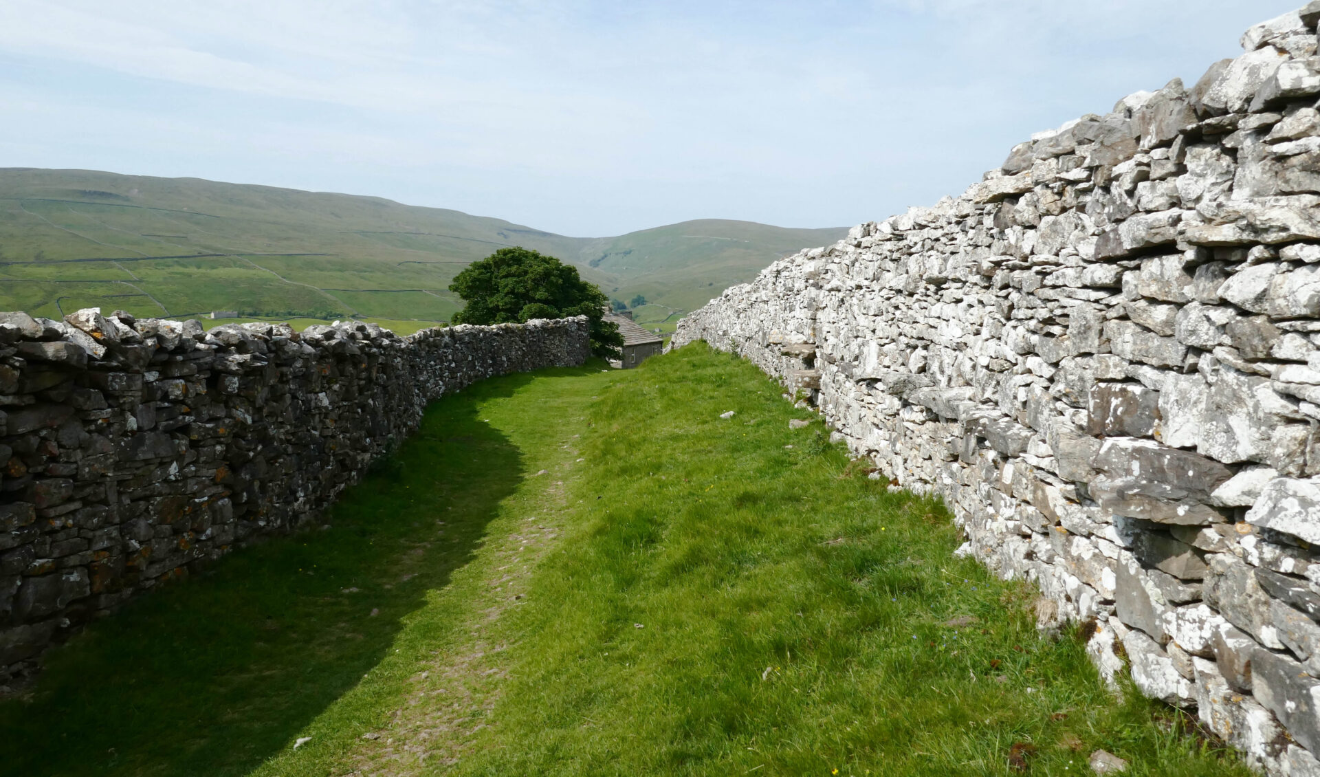 We left the hotel a bit after 9am and headed for the Pennine Way path beside the church. Unfortunately, it was closed so we went through the churchyard instead, which brought us onto the closed path just beyond the closure. From there a good footpath led us around the outskirts of Hawes and neighbouring Gayle to open country. Looking ahead to the dry stone walls it looked like they had been built by someone after a session in the pub! We’re used to seeing walls built in straight lines but these weaved left and right over the hillside ahead.