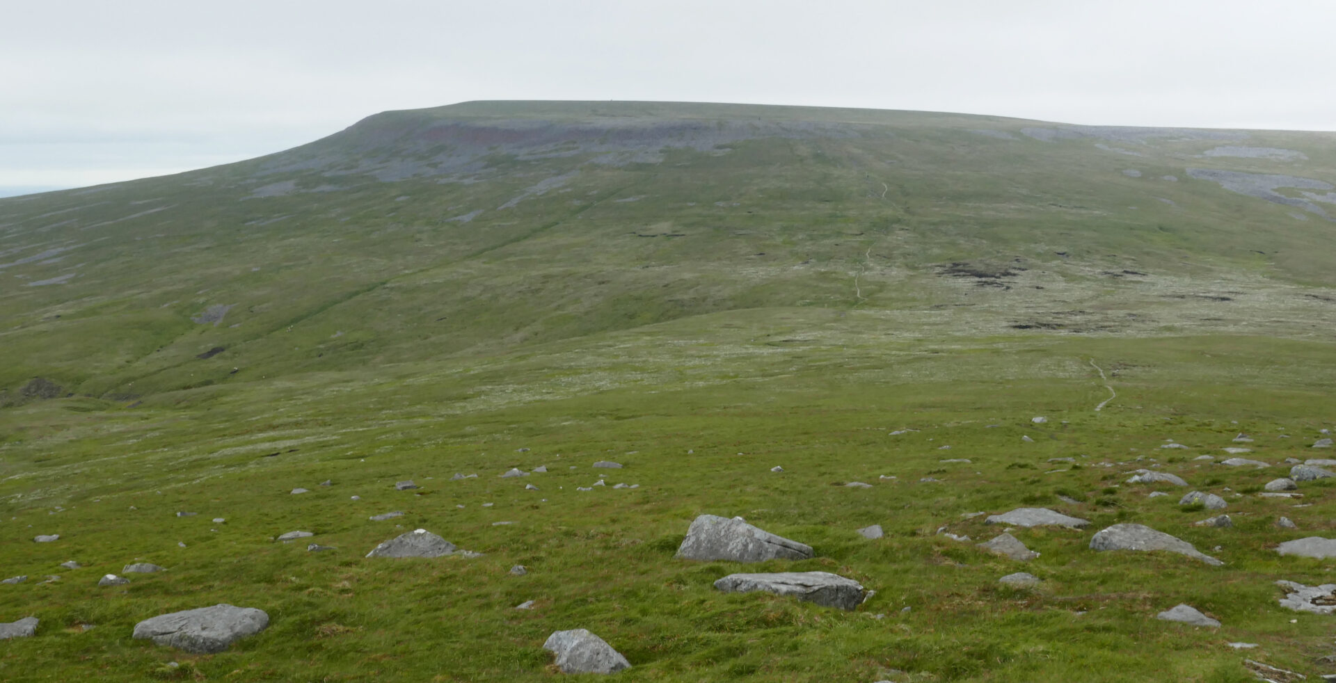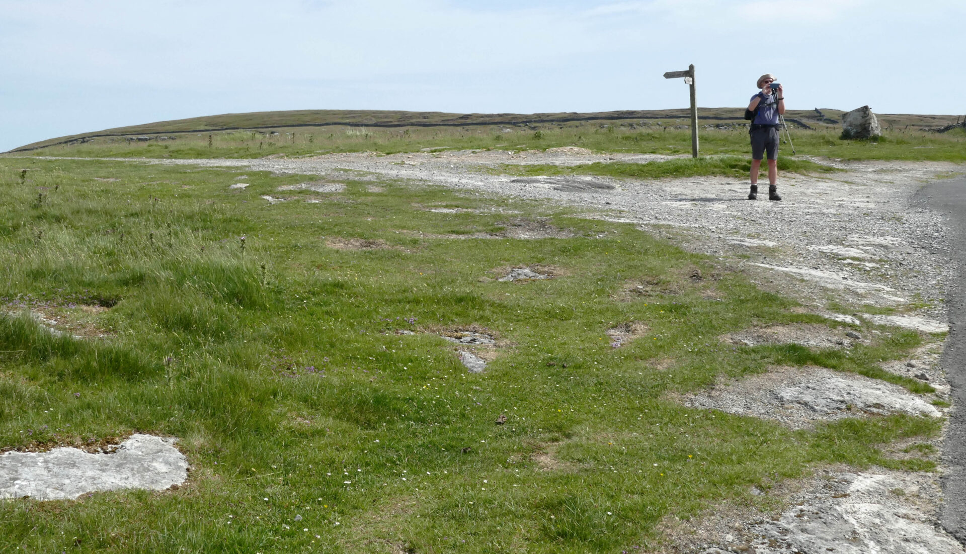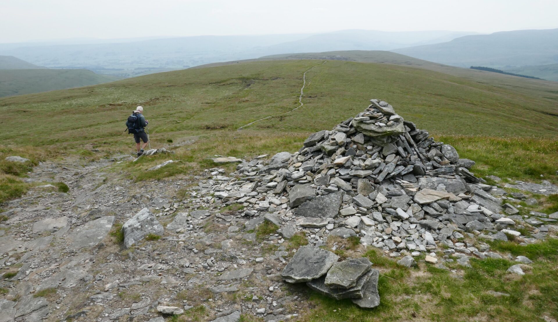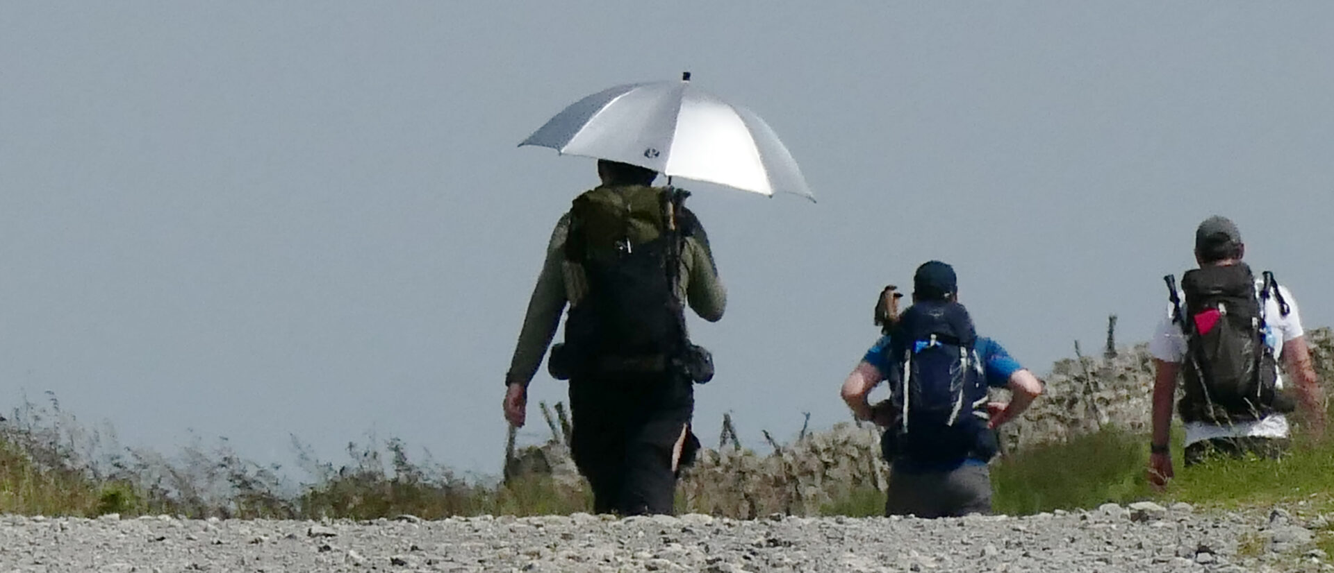 We were quickly climbing up the hillside on good paths to join a cart track around 10.30am and on to Cam High Road an hour later. This is an old Roman road. A walker with a sun brolly went past us heading north, that’s something you don’t see every day in the Yorkshire Dales! It must have come in handy later when we had heavy rain.
