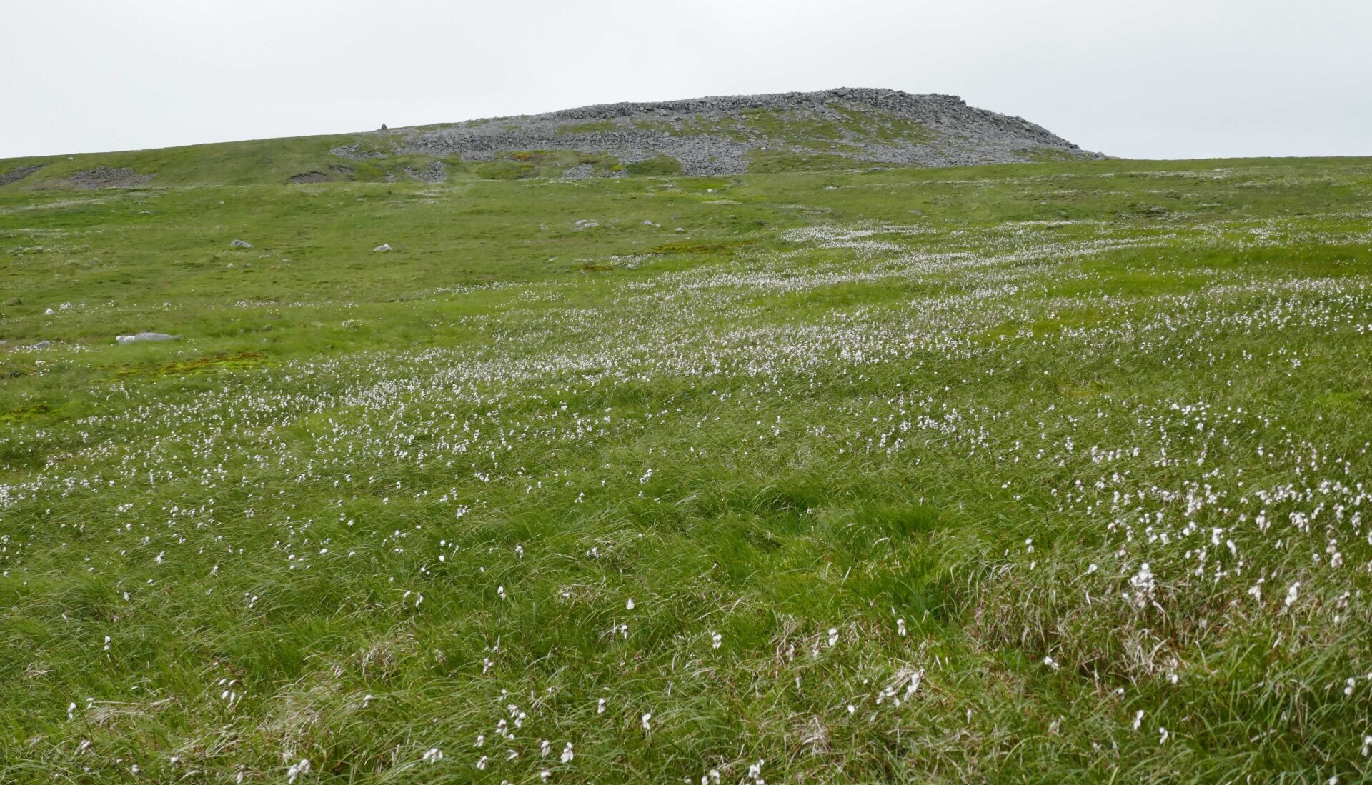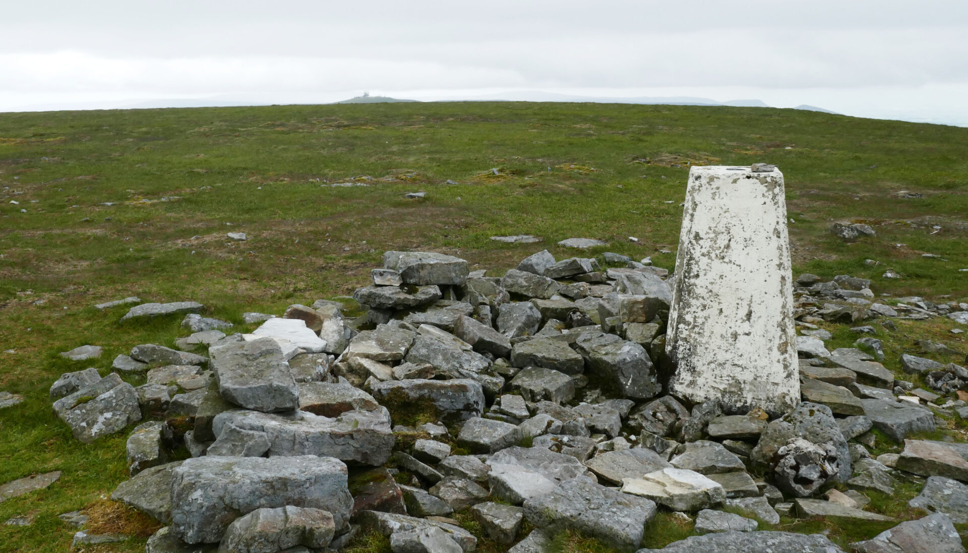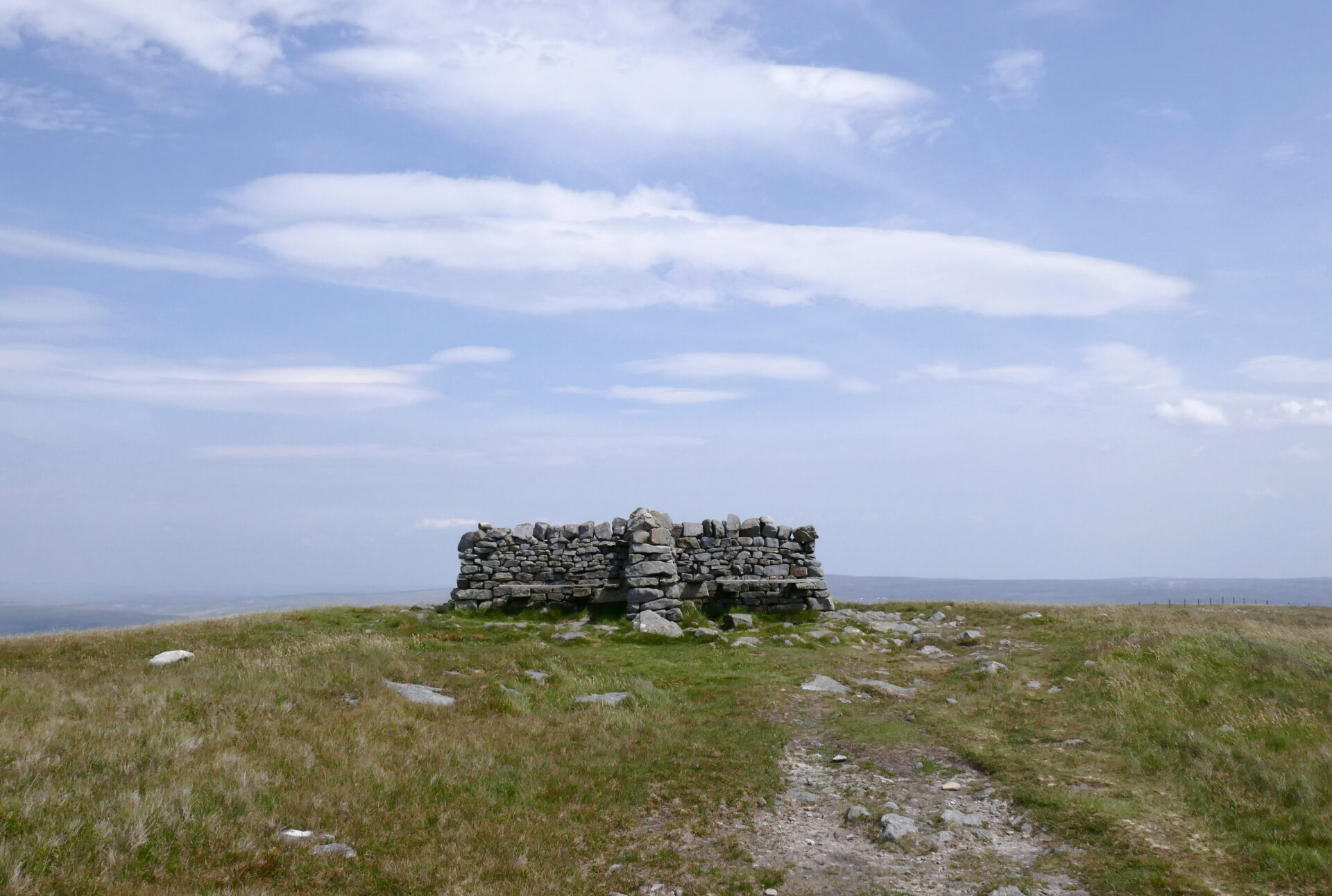 At 12.15pm we left the hut and just headed straight up towards the summit plateau as the obvious track was taking us a longer way round. It was just rough grass and heather, a bit lumpy in places, not too steep but pretty straightforward. The summit of Cross Fell was reached at 12.55pm. There’s a huge wind shelter and a trig point a short distance further on. It was dull and breezy but clear so we did have a few views, unlike the last time I did the Pennine Way in 1974.