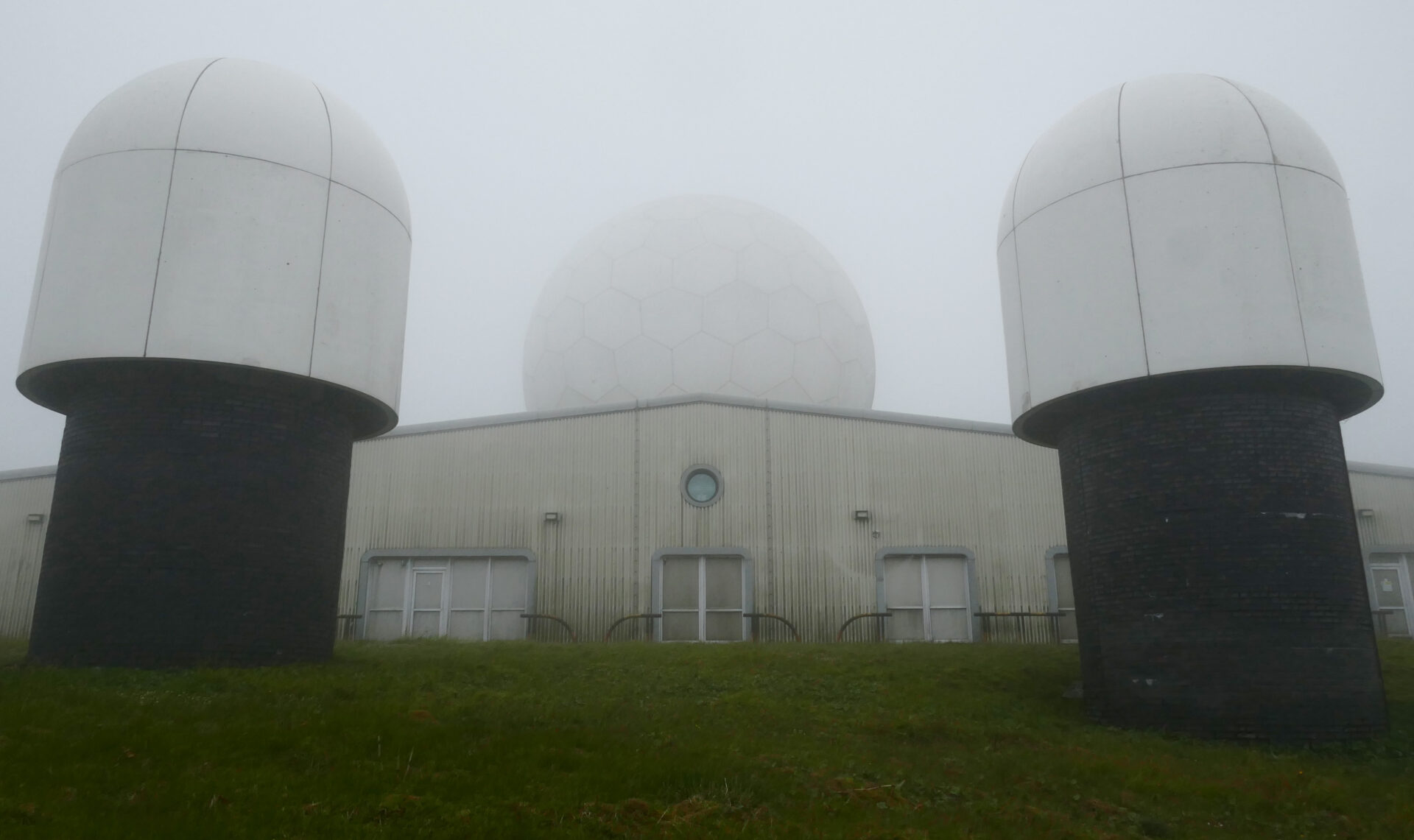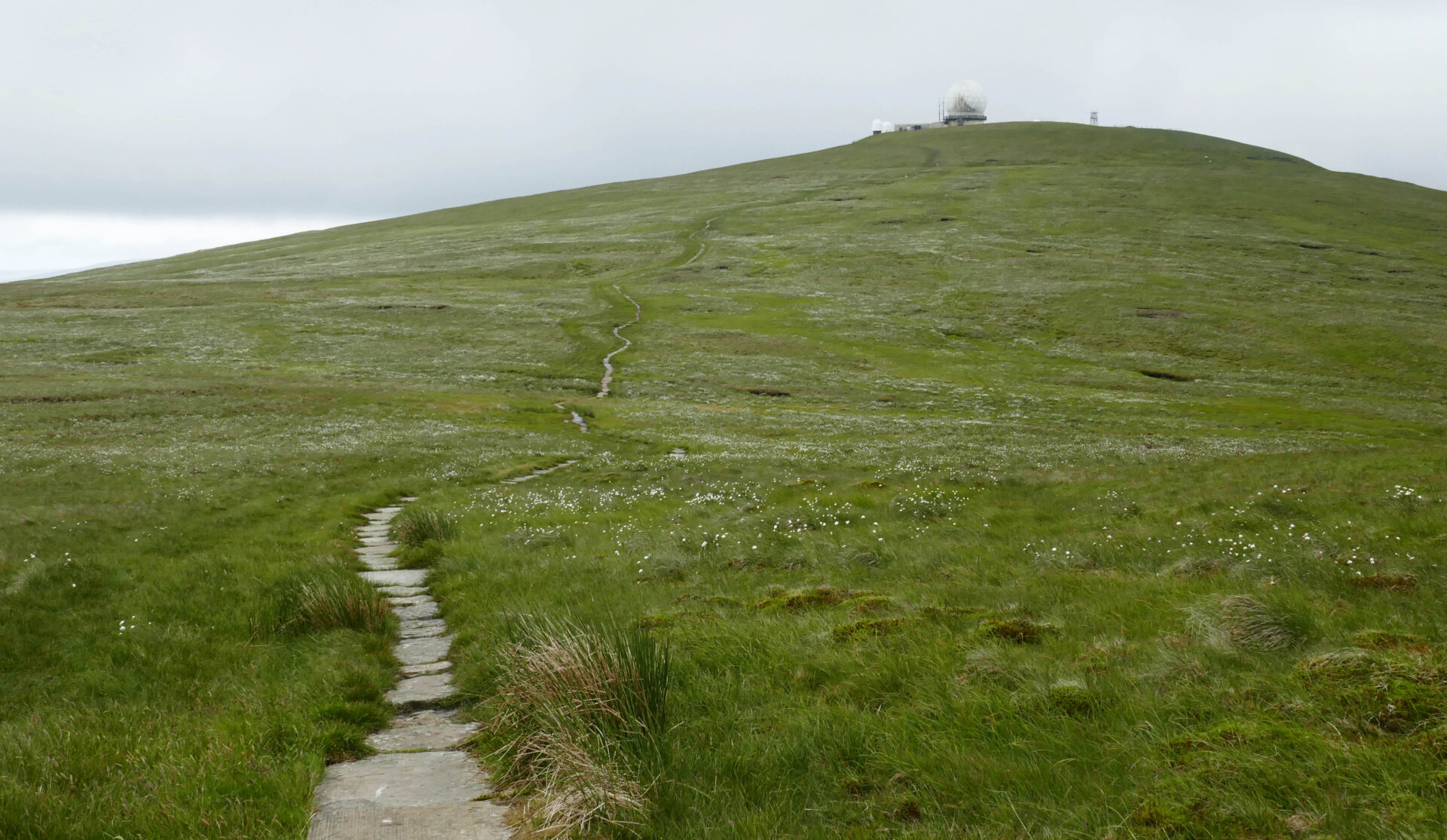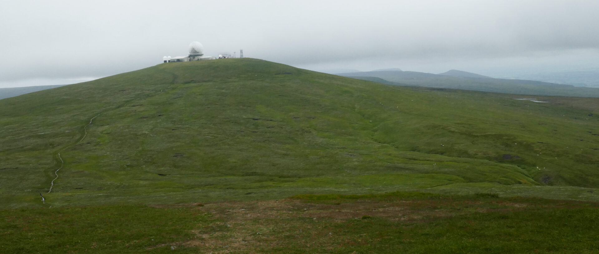 From Cross Fell, the highest point on the entire Pennine Way, we headed along the good path down and then up to Little Dun Fell. The clouds were closing in now so views were disappearing on high ground ahead but we had views from the dips in the ridge. Cross Fell behind us still looked clear. By the time we reached Great Dun Fell at 1.40pm the clouds were right down and visibility was very limited so we followed the GPS. The radar station, with domes and masts, on Great Dun Fell looked quite menacing in the mist!