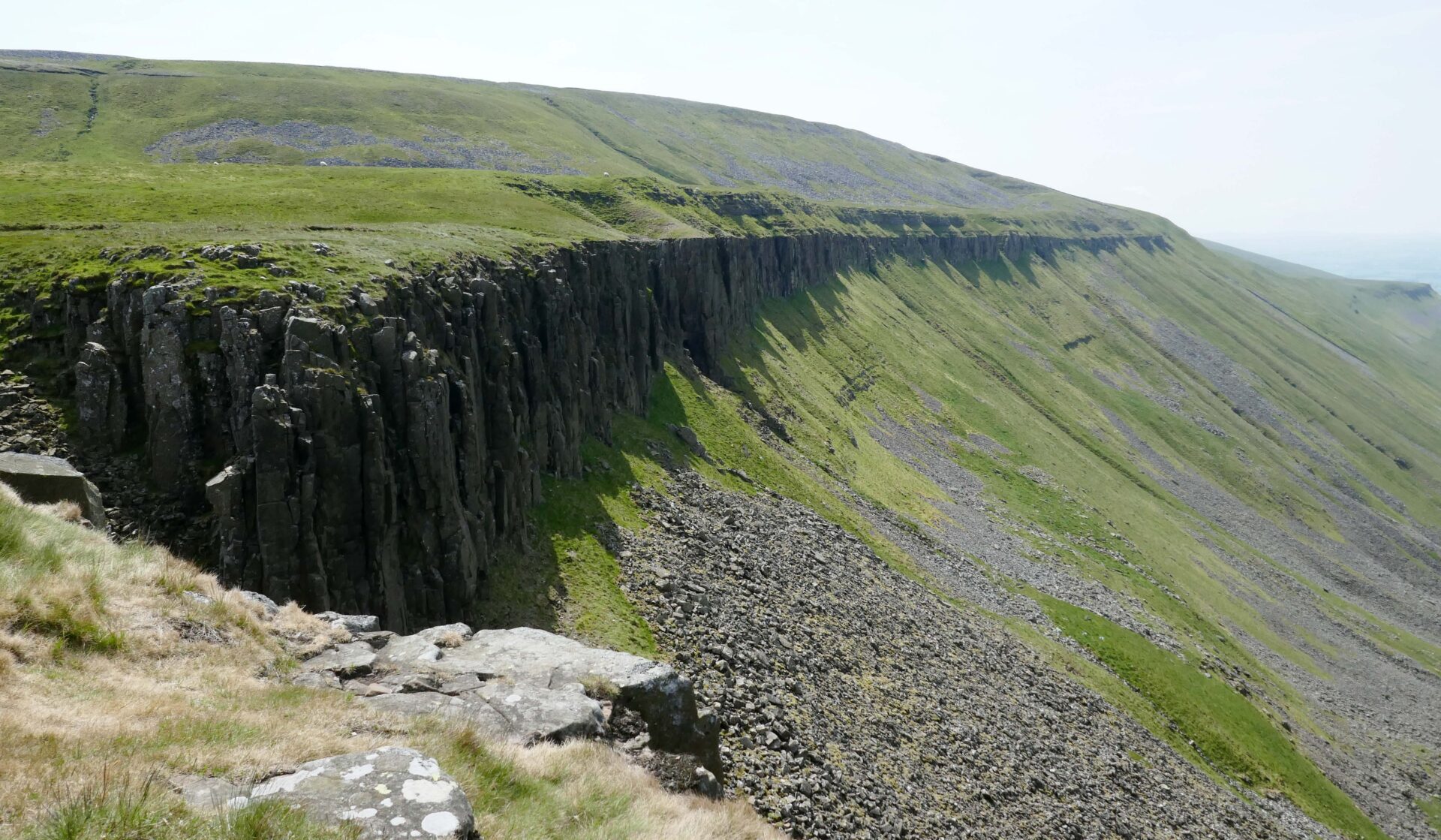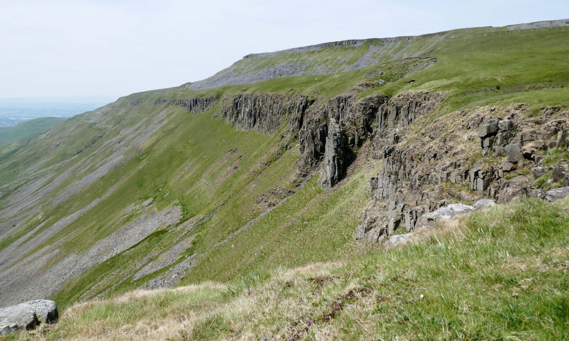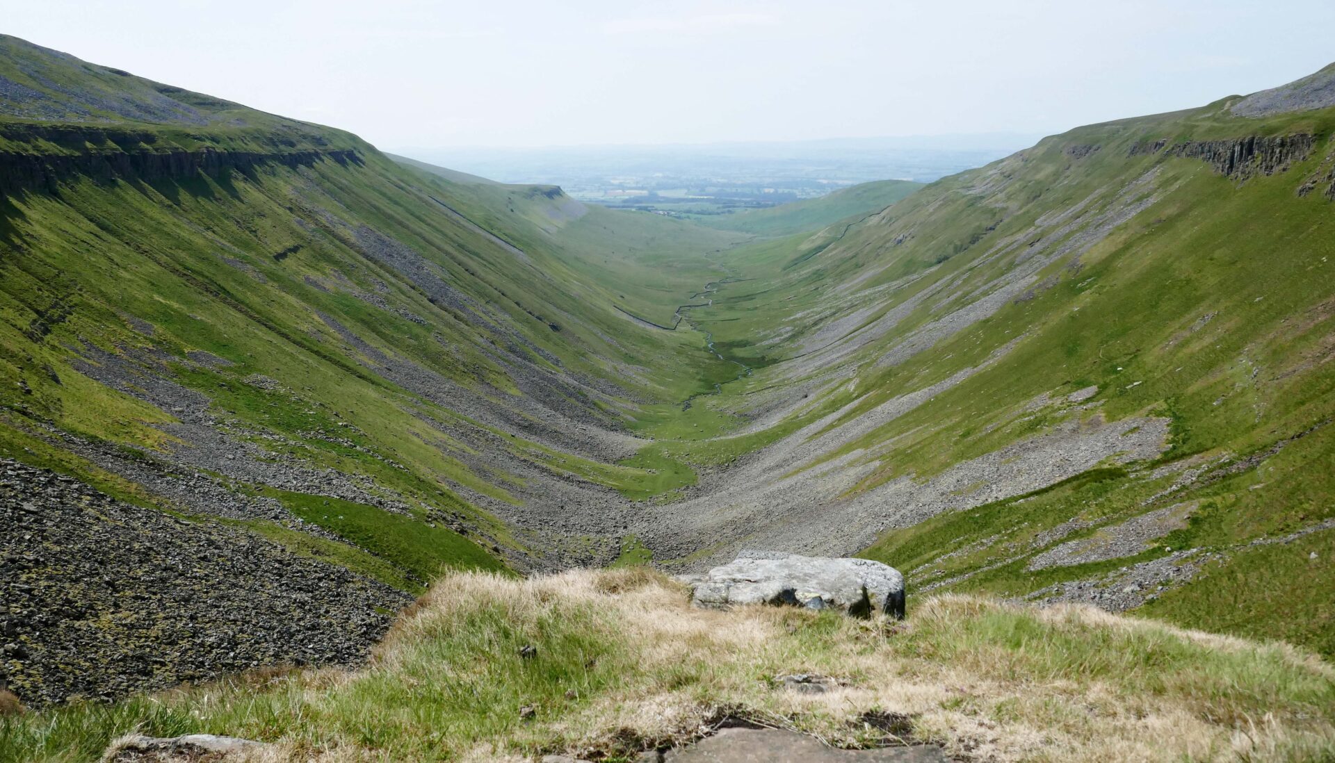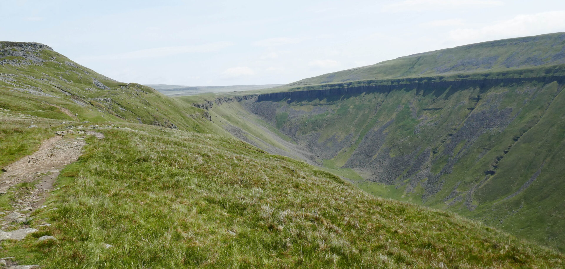 At 11.45am we had the first good views towards High Cup Nick from the rim. From here it took us about 30 minutes to reach the Nick, which is the very best viewpoint. It was a clear day so we had a spectacular view along the length of the narrow valley from our lunch break right in the middle of the Nick. I took quite a few photos so have a look at these to see what I mean. Unfortunately, I wasn’t carrying my medium format film camera with me or I would have some spectacular black and white landscapes.