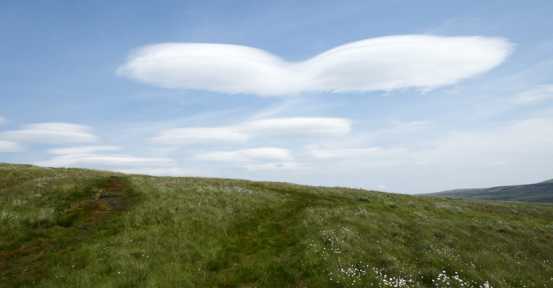 After about 15 minutes we headed off across High Cup Plain reaching the bridge over Maize Beck at 1.12pm. This was quickly followed by a sign telling us it was a military firing range on our right-hand side. The lenticular clouds were spectacular for quite a while as we walked over the moors here (often a sign of bad weather to come).