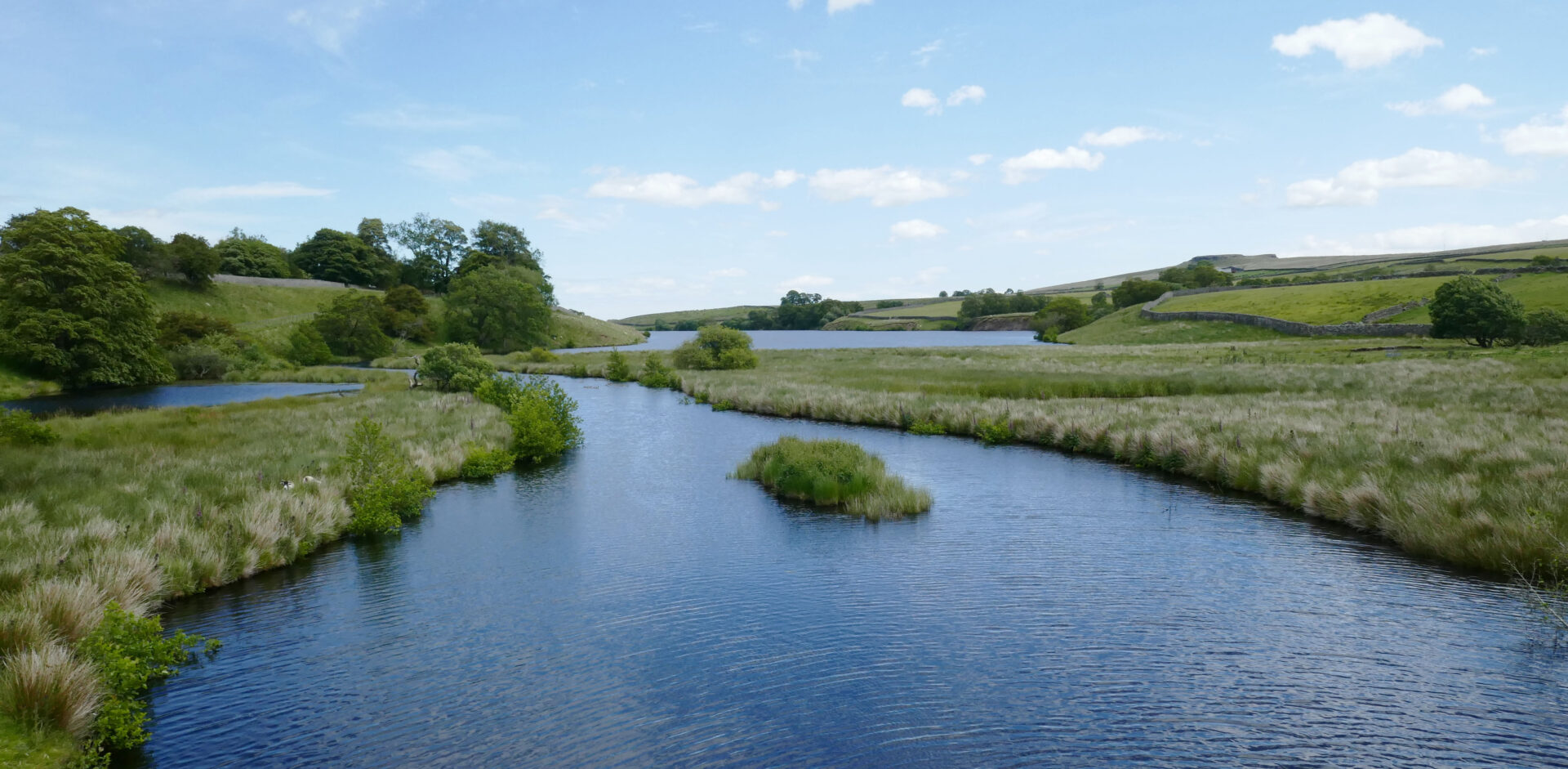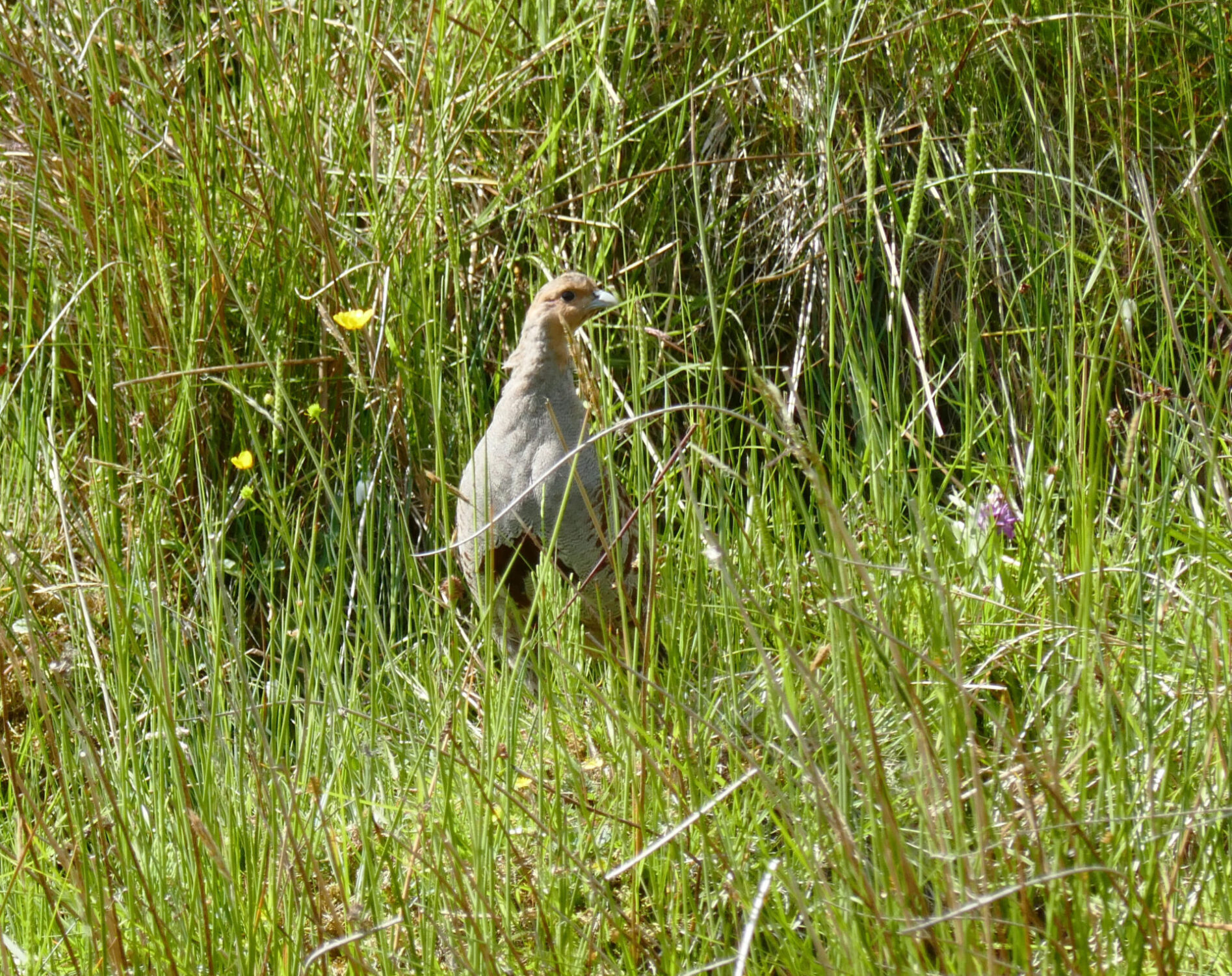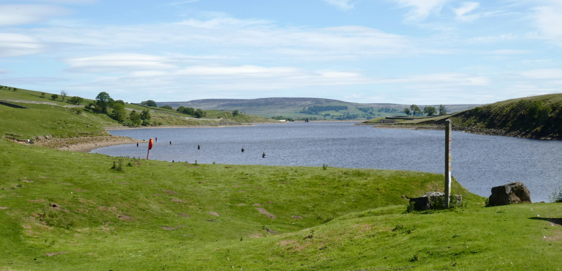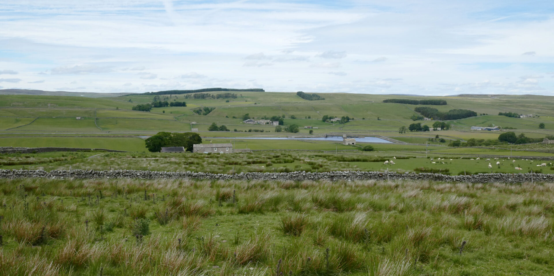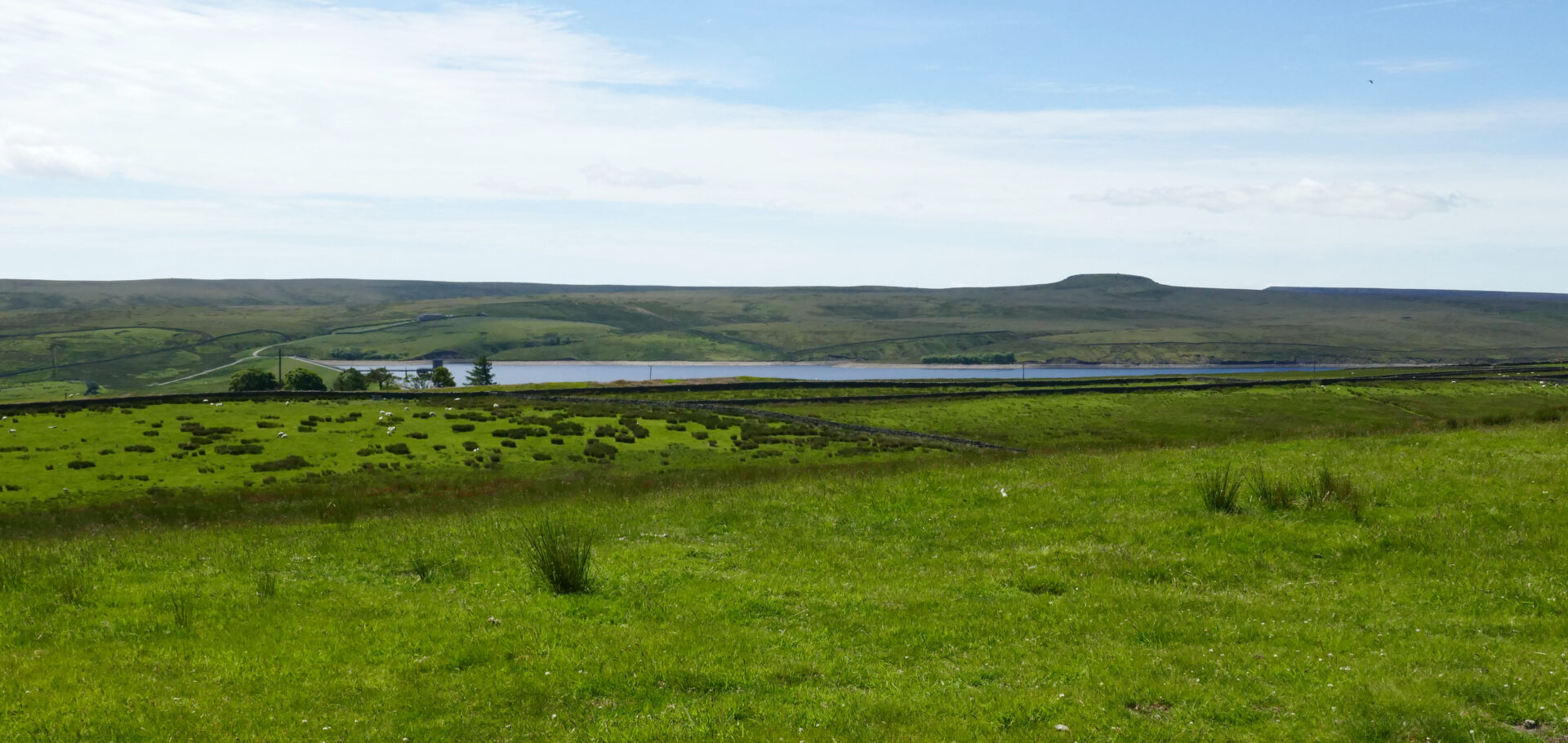The route crossed several green fields on a good track leading to Wythes Hill Farm at 11am. There was a family of 3 partridges on and beside the track as we walked down to the road. On crossing the road we were soon at Grassholme Reservoir where there were lots of people waist deep in the water fly fishing.