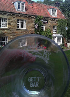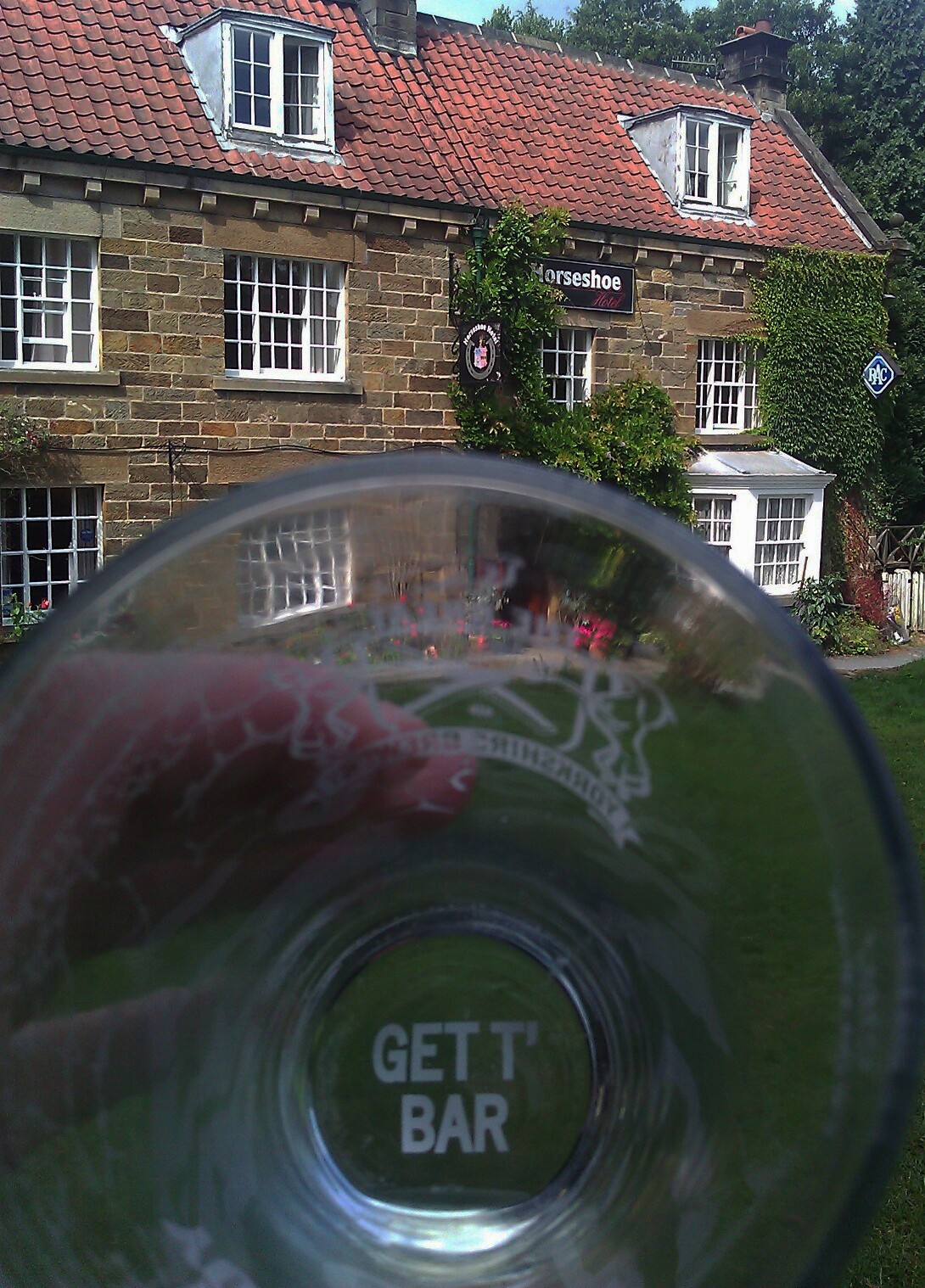Next was The Horseshoe Hotel at Egton Bridge at 1.30pm. The Men of Steel bitter was very tasty as we sat in the beer garden in the sun. The bottom of the glass was amusing, it read Get T’ Bar, the message was recorded for posterity by both of us (see below)!